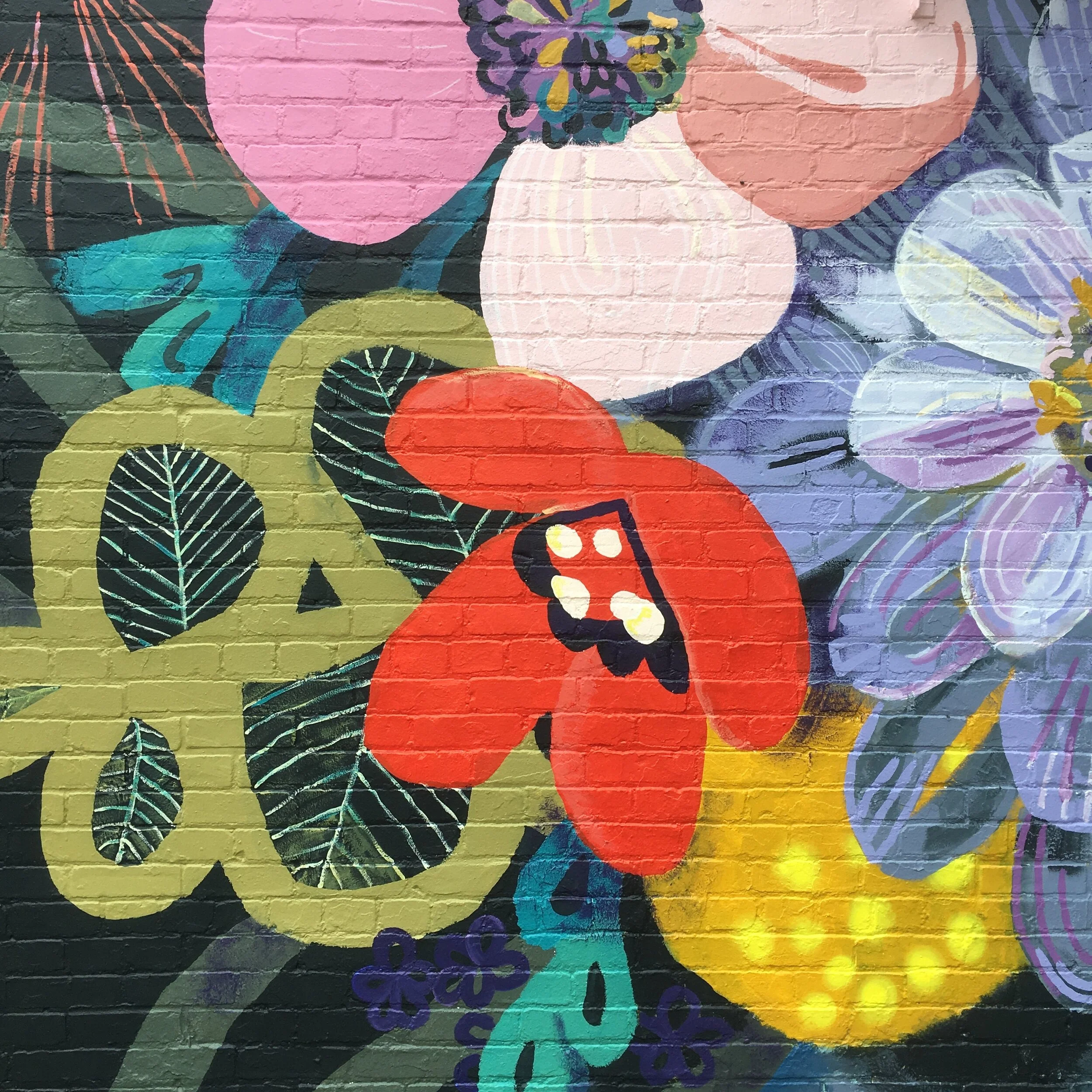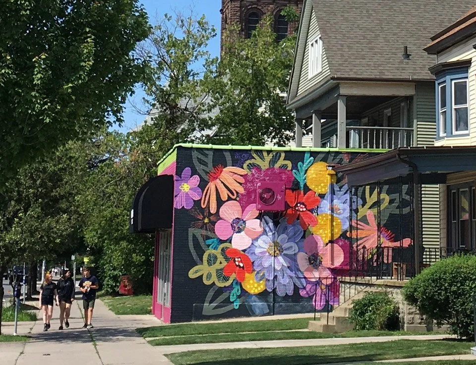 Garden Walk Buffalo and the Elmwood Village Association sought to create a vibrant floral mural to celebrate their 25th Anniversary. My design highlights recognizable and imagined flowers together in an energetic arrangement. This was my first mural, and it has quickly become an anchor in the neighborhood and is adored by the community, young and old alike.