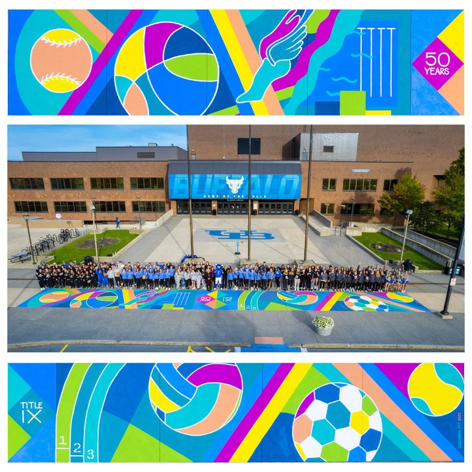 It was so fun to be on campus and field questions from students and visitors asking about what I was doing. It took about 10 days or so to paint (with a few rain days in between work days). And it is even better yet to see the mural activated by all of the female athletes! Here is a link to an article about the mural put out by UB.